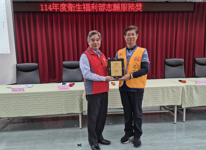 圖說:林處長(左)轉頒衛福部金牌獎予社區志願服務組長潘江河,肯定其無私奉獻。