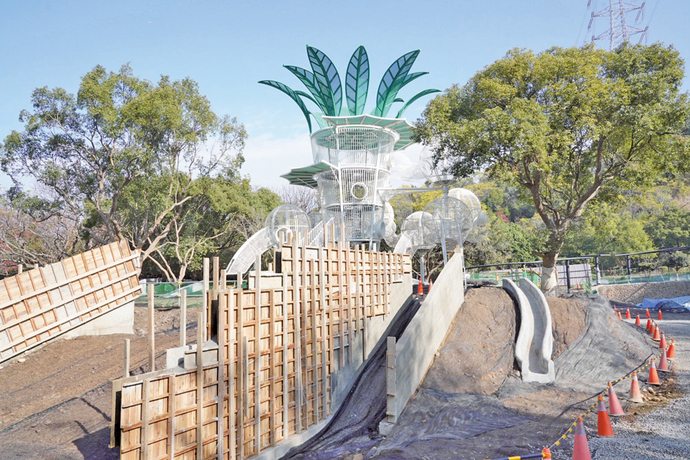 建設局表示,鰲峰山「谷溜遊戲場」基地面積約3,500平方公尺,規劃多層次遊戲動線,打造全齡共融的親子遊憩空間,目前工程進度穩定,預計於今年3月完工。