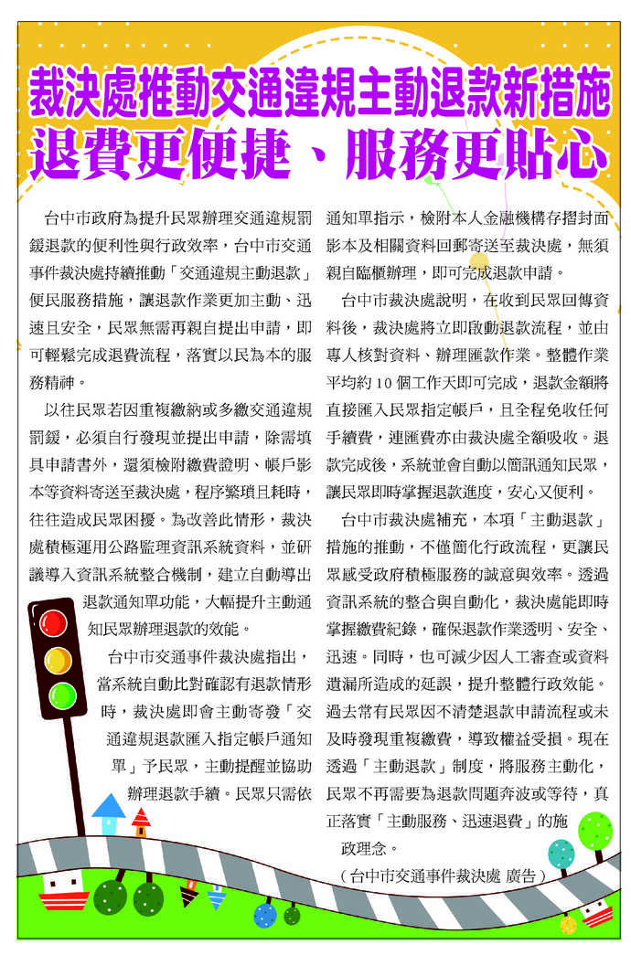 台中市裁決處補充,本項「主動退款」措施的推動,不僅簡化行政流程,更讓民眾感受政府積極服務的誠意與效率。 透過資訊系統的整合與自動化,裁決處能即時掌握繳費紀錄,確保退款作業透明、安全、迅速。 同時,也可減少因人工審查或資料遺漏所造成的延誤,提升整體行政效能。 過去常有民眾因不清楚退款申請流程或未及時發現重複繳費,導致權益受損。 現在透過「主動退款」制度,將服務主動化,民眾不再需要為退款問題奔波或等待,真正落實「主動服務、迅速退費」的施政理念。 (台中市交通事件裁決處廣告)