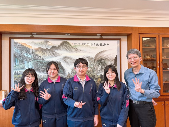 圖說:左起林靖恩、洪唯瑄、張鈞惟、林謹喬四位準台大生與林立校長合影。 (二信高中提供)