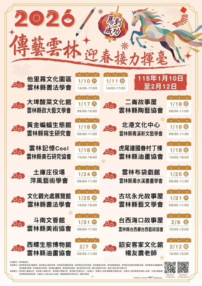 縣府文觀處指出,「傳藝雲林」迎春接力揮毫活動結合傳統年節習俗,推廣書畫文化,並特別串聯文化館舍來舉辦,讓民眾自然親近文化場域,是年節前夕最應景的藝文活動,每年吸引民眾熱烈參與。 今年縣府持續舉辦,場次更高達16場,邀請縣內12個藝文團體,包含雲林縣美術協會、雲林縣台西鄉台西藝術協會、雲林縣萍風藝術學會、雲林縣油畫協會、雲林縣政大藝文學會、雲林縣陶藝協會、雲林縣青溪新文藝學會、雲林縣濁水溪書畫學會、雲林縣美石研究協會、雲林縣寫生研究會、雲林縣書法學會、雲林縣藝文學會等,超過70位知名書法家與藝術家參與,以輪流接力的方式,在各具特色的文化館舍揮毫寫春聯、繪製年畫,免費贈送給來訪民眾。