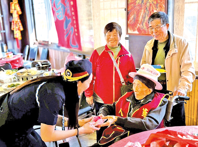 圖:華山基金會鹿谷愛心天使站長林佳緣送鹿谷鄉百歲人瑞壽桃祝福。 (記者李光曜/攝)