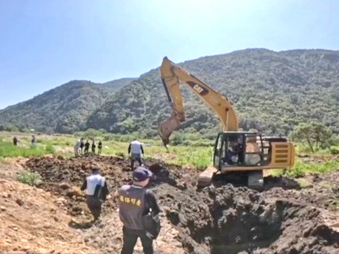 圖:南投縣埔里鎮鄰近眉溪流域之國有地遭非法傾倒廢棄土方案件開挖調查。 (記者李光曜/攝)