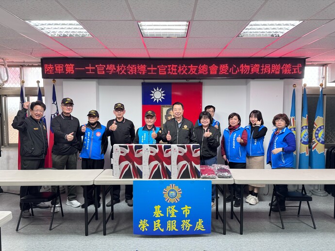【記者林富貴/新北市報導】15日下午,陸軍第一士官學校領導士官班校友總會吳孟陵理事長偕同校友總會關懷委員劉昌華先生、簡裕杰先生及王維堯先生,蒞臨基隆市榮民服務處,捐贈愛心毛毯物資一批,委請榮服處在春節前,轉發給亟需照顧關懷的榮民眷袍澤,表達該會關懷之意;此外,關懷委員劉昌華先生也響應此活動,捐贈毛帽組一批,委請榮服處於春節前轉發馬祖地區榮民眷;一行人受到榮服處方正處長及同仁熱忱接待,榮服處為此一活動舉行簡單隆重的捐贈儀式,方正處長並回贈感謝狀及紀念品,表達誠摯謝意。