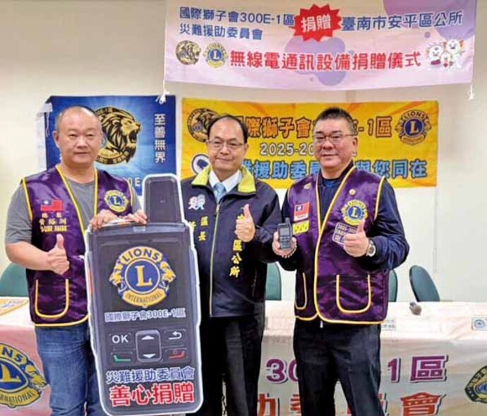 【記者潘志航/台南報導】有感於去年丹娜絲颱風重創台灣西南部,尤以台南沿海地區災情最為嚴重,居民經歷停水、停電、斷訊,生活宛如孤島,反映出基礎設施的脆弱,引發社會對災防關注與討論。 為充實地方救災裝備,國際獅子會300E-1區災難援助委員會慨然捐贈安平區公所手提無線電通訊設備,挹注安平區公所災防量能,由安平區長蕭泰華代表受贈並頒發感謝狀表彰善舉,多位里長亦共襄盛舉親赴盛會,一同參與。 國際獅子會300E-1區災難援助委員會主席謝漢章指出,去年風災引發通訊中斷導致災情無法及時傳出,凸顯救災通訊設備不足。