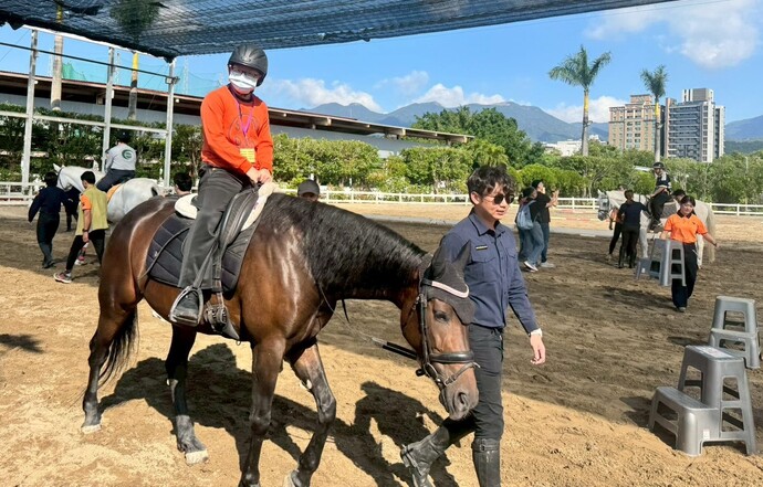 【記者林富貴/新北市報導】昨(11)日,新北市政府警察局騎警隊舉辦「關懷弱勢馬術體驗」活動,主動邀請新北市政府社會局委託伊甸基金會辦理的「新莊幸福小作所」40位身心障礙學員,前往漢諾威馬術俱樂部參與餵食馬匹與騎乘體驗,學員在騎警隊員與服務人員的陪伴下,近距離與馬匹互動、餵食與騎乘,透過溫柔穩定的馬步節奏與細心引導,讓原本緊張不安的情緒逐漸放鬆,轉化為燦爛笑容,在體驗中學習信任、勇氣與情緒安定,也展現警察人民保母溫柔的一面。