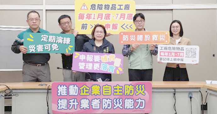 【記者吳淑華/台南報導】南市府呼籲工廠製造、使用或存放危險物品達管制量以上者,須於今年1月底前,依《工廠危險物品申報辦法》及《工廠危險物品投保公共意外責任保險辦法》規定,完成工廠危險物品申報。