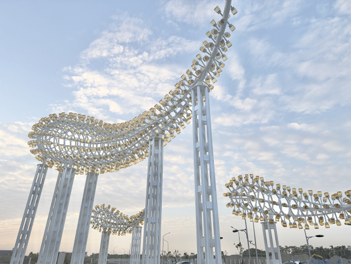 《光之祥雲》藝術裝置將作為園區常設藝術持續亮燈展示。 白天可欣賞玻璃材質在自然光下的色澤層次,夜晚則透過循環光影展演,營造適合散步、停留與拍照的夜間場域,持續陪伴民眾走入北港糖廠,感受場域轉化後的文化風貌。