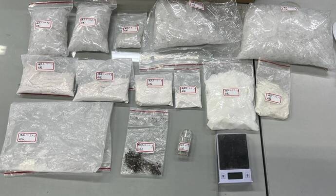 經專案小組漏夜追蹤,於隔日(21日)4時31分許,由副分局長曾柏仲帶隊於五股區查獲接應共犯許男(44歲),經查許男駕駛自小客接載蘇男前往桃園地區後,蘇男於桃園地區自行租賃車輛後自行駕車離去。 並於許男之隨身攜帶包包內有大量毒品,海洛因5包(總毛重79.7公克)、安非他命5包(總毛重945.3公克)、依托咪酯2包(總毛重102.8公克)、依托咪酯煙彈1顆(毛重5.7公克)、大麻1包(毛重1.2公克)、電子磅秤及手機等,分局將持續溯源追查毒品來源並已鎖定蘇男行蹤刻正追查到案。