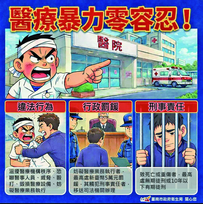 【記者黃燕/台南報導】醫療機構是守護民眾生命健康的神聖殿堂,醫事人員更是在第一線與病魔搏鬥的英雄。 然而,過往發生的醫療暴力事件,不僅傷害了醫護同仁的身心健康,更嚴重干擾正常的醫療秩序與患者服務。 臺南市政府衛生局重申,對於任何形式的醫療暴力絕對秉持「零容忍」態度。