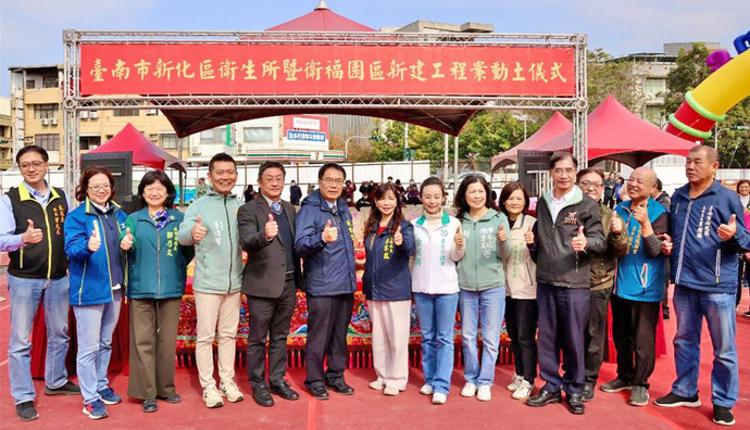 【記者潘志航/台南報導】為強化地方基層醫療服務能量,並完善多元社會福利照顧體系,新化區衛生所暨衛福園區舉行動土典禮,臺南市長黃偉哲親自出席主持,與國健署林國甯組長、地方民意代表、里長及各界貴賓共同見證重要時刻,祈願工程順利、如期如質完工,為新化區公共建設揭開嶄新篇章。 市長黃偉哲表示,新化區衛生所暨衛福園區為市府重要施政建設之一,因應高齡化與少子化社會的雙重挑戰及市民多元照顧需求,市府秉持「以人為本、全齡照顧、在地服務」的核心理念,整合醫療、照顧及社會福利資源,規劃打造兼具專業性與友善性的複合式衛福園區,未來將進駐衛生所、日照中心、托嬰中心、多功能生活館、親子悠遊館及身心障礙者自立生活支持服務中心等,提供嬰幼兒、家庭、長者及身心障礙者全方位、一站式的照顧與支持服務,不僅可強化基層公共衛生及疾病預防功能,擴充長照與托育服務量能,協助身心障礙者培力自立,減輕家庭照顧負擔,亦可提升提升整體生活品質,實踐「老有所養、幼有所育、弱有所扶」的施政目標。