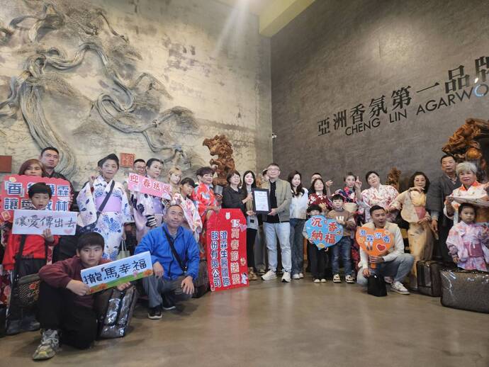 澄霖沉香董事長陳品宏董事長更在園區與家扶小朋友們舞獅,古木老松庭園美景,象徵過去一年「蛇」麼煩惱都拋開、福運「馬」上來。 雲林家扶主任廖志文感激澄霖沉香之旅享受園區放鬆舒壓,和服體驗更是阿公阿嬤們歡笑不斷,尤其「沉香禮盒」讓家長們在家舒緩放鬆新的一年「馬」上好幸福。
