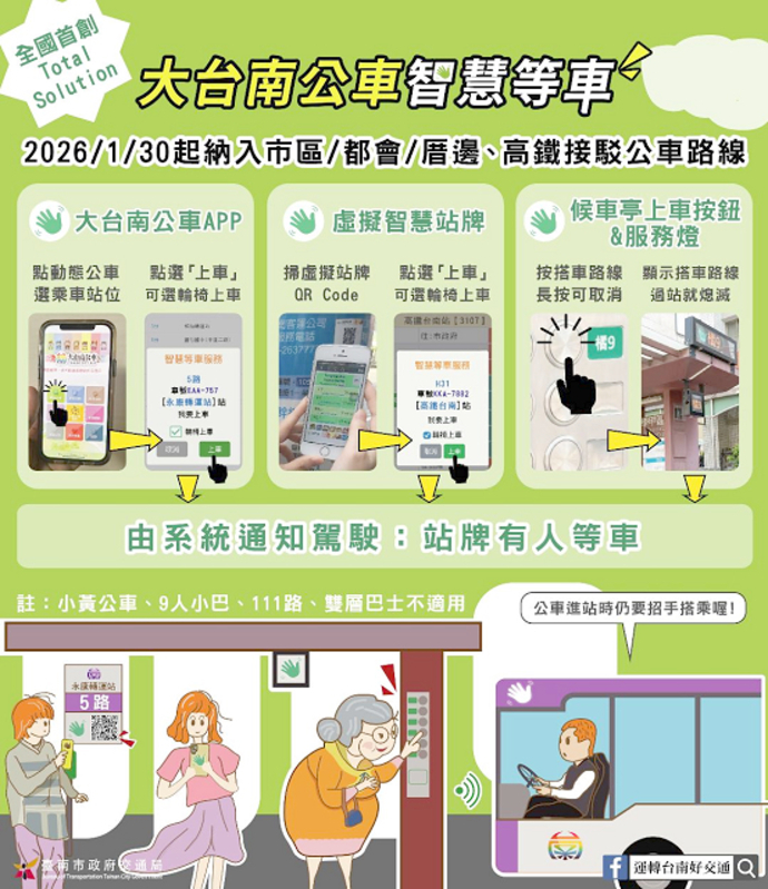 【記者袁登峯/台南報導】大台南公車「智慧等車」服務功能上線以來迄今已突破45萬使用人次,即日起再度擴大服務範圍,納入本市市區公車路線,連同先前上線的六大幹支線,所有公車路線皆可使用「智慧等車」功能,從站牌即可直接通知司機有人等車,再也不怕公車過站不停,更是全國唯一普遍建置此一智慧功能的縣市。