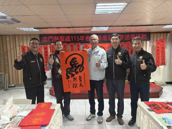 【記者林富貴/金門報導】配合國人農曆年節張貼春聯的傳統習俗,金門縣榮民服務處在財團法人榮民榮眷基金會及會屬事業機構的支持下,於3日在榮服處五樓會議室共同辦理「寫春聯、送祝福」書法活動,邀請將軍書法家鄭有諒、前處長呂媽定,以及金門書法學會陳應德老師齊聚一堂揮毫,書寫春聯贈送地區榮民眷,讓大家提前感受濃厚的過年氣氛。