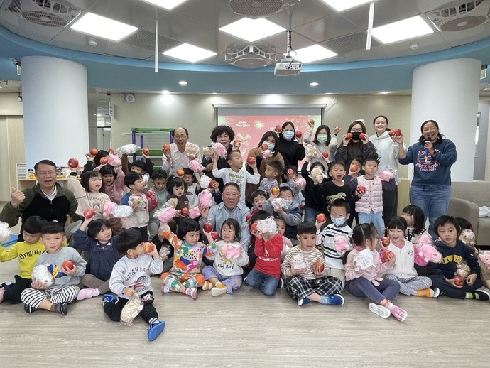隨後,由家主任及副主任一一親手將蘋果與綿羊娃娃送到每位小朋友手中,孩子們收到禮物後,臉上洋溢著開心的笑容,有的高舉禮物向家長分享喜悅,現場充滿幸福氛圍。