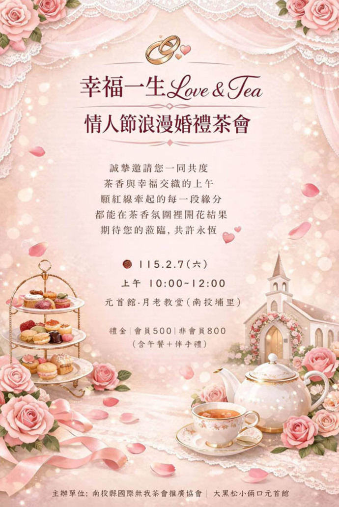 【記者譚國民/報導】為迎接情人節的到來,南投縣國際無我茶會推廣協會攜手大黑松小倆口元首館,將於115年2月7日(星期六)在埔里元首館愛情故事館與月老教堂,舉辦《Love&Tea》情人節浪漫英式茶會,結合英式下午茶文化、在地茶葉品飲與愛情意象,打造一場兼具文化深度與浪漫氛圍的茶會體驗。