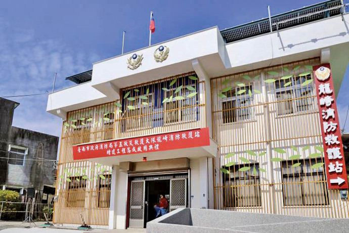 市府消防局說明,本次增建工程除優化內部機能外,外觀設計也融入在地特色,結合現代化機關識別與龍崎自然風貌。建築外圍及入口設置燈箱式LOGO與鮮明烤漆,提升夜間辨識度,確保民眾在緊急時能迅速辨識求助位置;同時保留並重新整理以「竹子」為主題的裝飾格柵,延續在地自然美學,使廳舍呈現簡潔明亮的現代警消建築風貌。