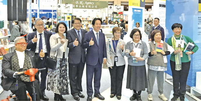 圖說=台北書展基金會董事長郝明義(左起)、文化部長李遠、立法委員吳思瑤、總統府秘書長潘孟安、總統賴清德、國立臺灣文學館長陳瑩芳、文訊雜誌社社長封德屏、九歌出版社總編輯陳素芳、聯合文學出版社總編輯周昭翡一同於台北國際書展「字遊,自在」主題展館合影。 (圖/國立臺灣文學館提供)
