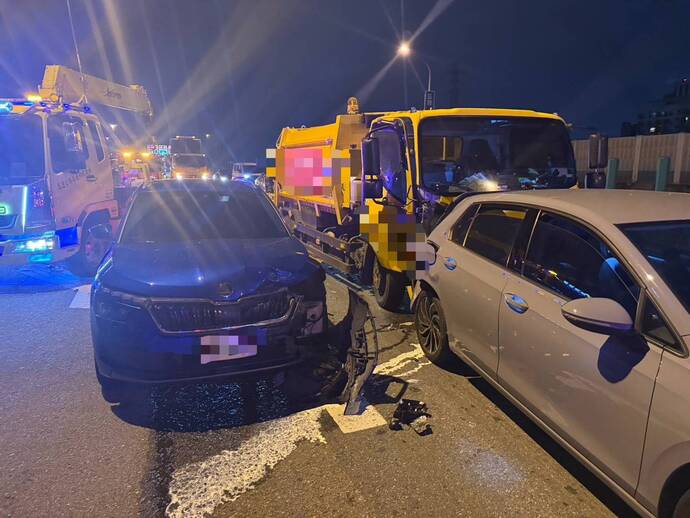 蘆洲警獲報立即派遣成州所及交通分隊到場處理避免二次車禍,經了解為環保回收車駕駛郭**(男,35歲)為閃避謝**(女,47歲)所駕駛自小客車,不慎擦撞劉**(女,50歲)所駕駛自小客車及韓**(男,52歲)所駕駛之自小客車。