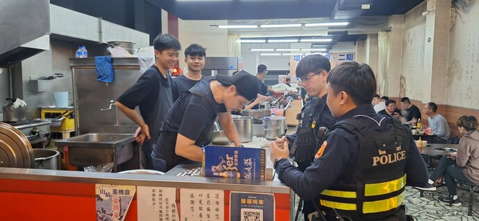 新莊警分局表示,連假期間聚會熱絡,若因飲酒或情緒升溫,易衍生口角衝突。 警方運用本分局自製之「防制聚會餐敘發生鬥毆宣導紀錄表」,逐一向轄內餐飲及易聚會場所加強宣導,截至目前共約制業者77間,請求業者協助留意顧客互動情形,如發現叫囂、推擠等衝突徵候,應即時通報警方到場處理,防範事態擴大。