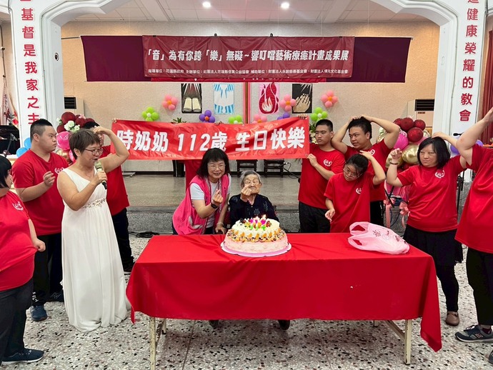 音樂會後,信實協會與並於在座的來賓及長輩們為獨居半世紀的花蓮縣光復鄉大馬村遺眷-時常鳳女士歡慶112歲的農曆生日。 時常鳳憶起往事提及新婚不到一個月,先生即因國共內戰隨國民政府來台,夫妻分隔兩岸數十年,約民國七十餘年才至花蓮依親定居,先生過世後她即獨居,信實協會常年關心時奶奶就像是家人一樣,信實協會會員朱瑀瑄、葉惠萍及陳宥安在民國108年,帶著104歲的時奶奶回中國大陸的上海與其兄弟姊妹及侄子、侄女及侄孫輩們團聚,時奶奶歷盡文革及戰亂動盪時代,於超過百歲的年紀還能回大與親人團聚,內心激動不已。 時奶奶同時也是去年光復災區的受災戶,奶奶回憶起聽聞媒體傳來光復的災情慘重,因為在鳳林分院住院中,所以毫髮未傷。 目前,時奶奶因身體不適仍住在台北榮總鳳林分院病房,今天從病房請假參加棒鐘演湊及慶生活動,時奶奶直說很有意思也非常感謝。