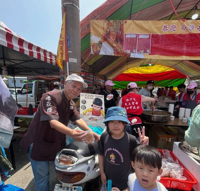 除熱食供應外,rhalife赤崁糖亦準備「魷魚游戲Dalgona糖餅」及來自「下營一畝田香草莊園」的「勇芯茶」,共計800份,免費發放給信徒享用。