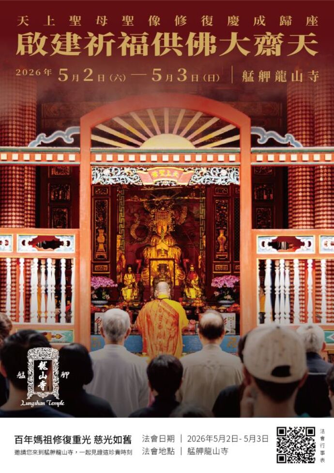 歷經兩年,天上聖母已於日前2026年4月19日圓滿安座;為感念聖恩,也與大眾共享此一圓滿因緣,本寺特啟建「祈福供佛大齋天」法會,慶祝天上聖母重光歸座,並為十方善信消災祈福、福慧增長。