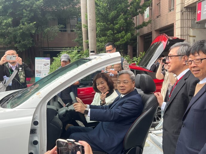 圖說:教育部楊玉惠司長與經濟部龔明鑫部長試乘鴻華先進捐贈之電動車。 (教育部提供)