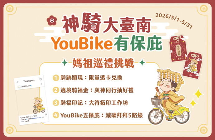 【記者袁登峯/台南報導】迎接農曆三月「媽祖生」宗教盛事,自115年5月1日起至5月31日,臺南市政府交通局攜手微笑單車股份有限公司(YouBike)推出「神『騎』大臺南,YouBike有保庇|媽祖巡禮挑戰」活動,串聯全市13間天后宮與路線周邊43處YouBike場站,鼓勵民眾利用大眾運輸來趟低碳「Bike」拜之旅,騎滿5次即可抽600元YouBike騎乘券與多項廟宇限量文創好禮,騎愈多,中獎機率愈高!
