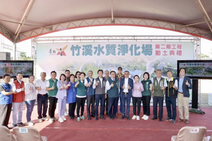 【記者吳淑華/台南報導】台南市竹溪水質淨化場第二期工程於(30)日下午舉行開工動土典禮,藉由本期工程可將竹溪流域的47,000噸污水全量截流,提升竹溪的水質,完成竹溪整治的最後一塊拼圖。 市長黃偉哲親臨主持祝禱儀式,他期許工程順利如期完成,讓竹溪成為潔淨並充滿生命力的河川,也為民眾增添一處休閒的好地方。