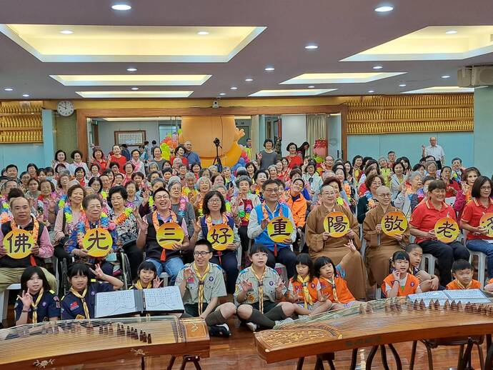 【記者林富貴/新北市報導】在重陽節前夕,佛光山三重禪淨中心特別於26日舉辦「佛光三好、重陽敬老」活動,有200多位長者在家人的陪同下歡喜參加,除有古箏、吉祥鼓、排舞表演,並有中西醫義診、整復保健、義剪頭髮,甚至由醫甲館專為長輩修剪腳趾甲。 佛光幼童軍和青年團員們為長者跪膝奉茶,以彰顯傳統重陽敬老的美德。