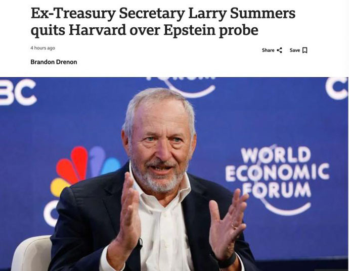 據報導,哈佛大學在25日的一份聲明中表示,薩默斯的離職“與哈佛大學正在對愛潑斯坦案相關文件進行的審查有關”。