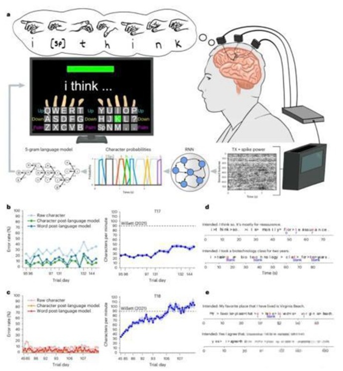 在本項研究中,論文第一作者和通訊作者、美國麻省總醫院JustinJ.Jude與同事及合作者開發出一種腦機接口,在臨床研究中將其植入兩名四肢癱瘓(肢體及軀幹癱瘓)患者的大腦皮層,兩位患者其一患有肌萎縮側索硬化症(ALS),另一位有頸椎脊髓損傷,研究團隊讓參與者嘗試進行QWERTY鍵盤打字的手指運動,用此間腦活動訓練了一個深度神經網絡,腦活動由植入中央前回(參與自主運動的腦區)的電極記錄。