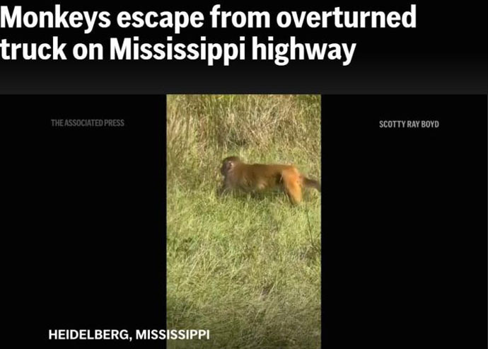 【記者林璟坤/外電報導】當地時間28日,美國密西西比州一條高速公路上,一輛運送猴子的卡車發生側翻,導致被運輸的猴子逃脫。
